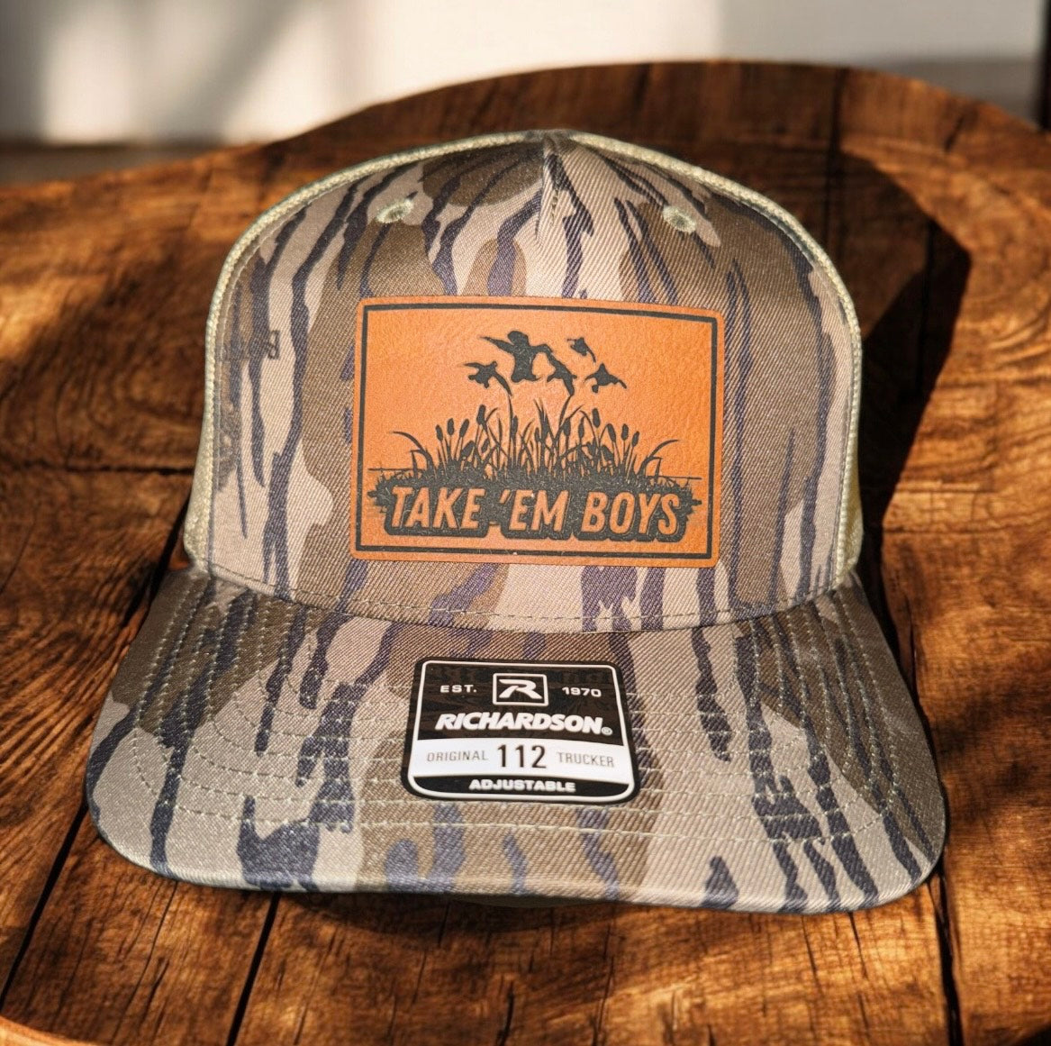 Introducing the Mossy Oak Bottomland TAKE'EM BOYS Hat. Designed with the iconic Mossy Oak Bottomland camo, this hat is perfect for any hunting enthusiast. Featuring the phrase "Take 'em Boys" on the front, it's sure to bring a sense of camaraderie to your next hunting trip. Stay hidden and connected with this must-have accessory.